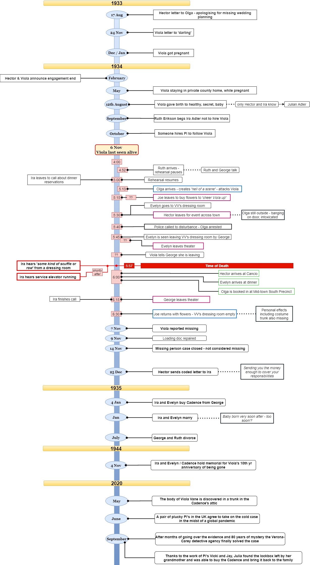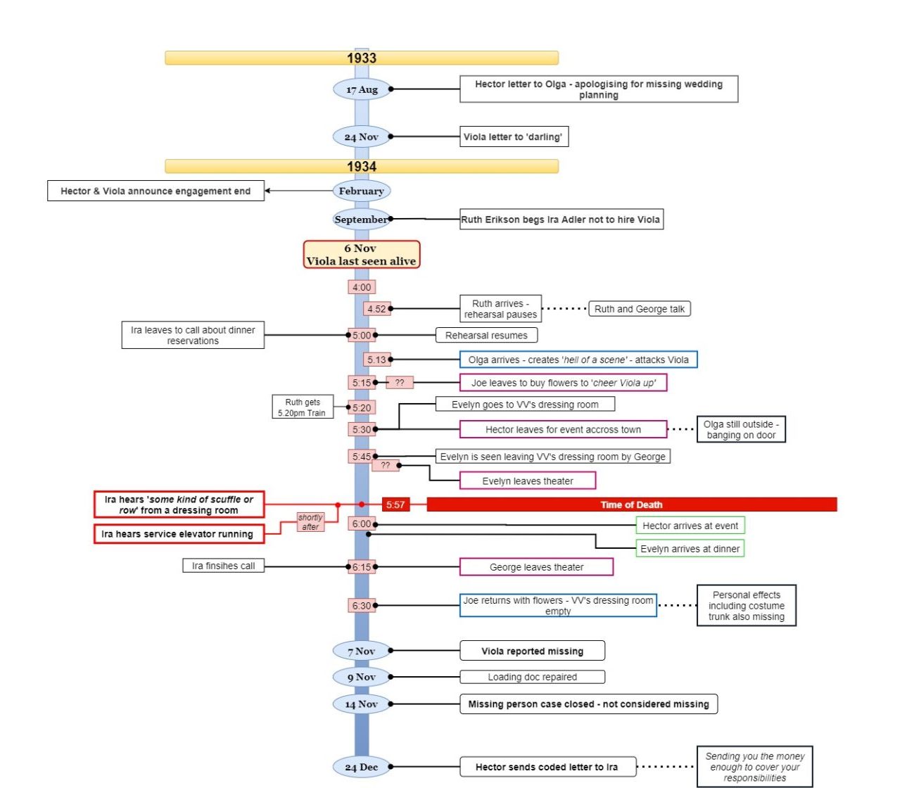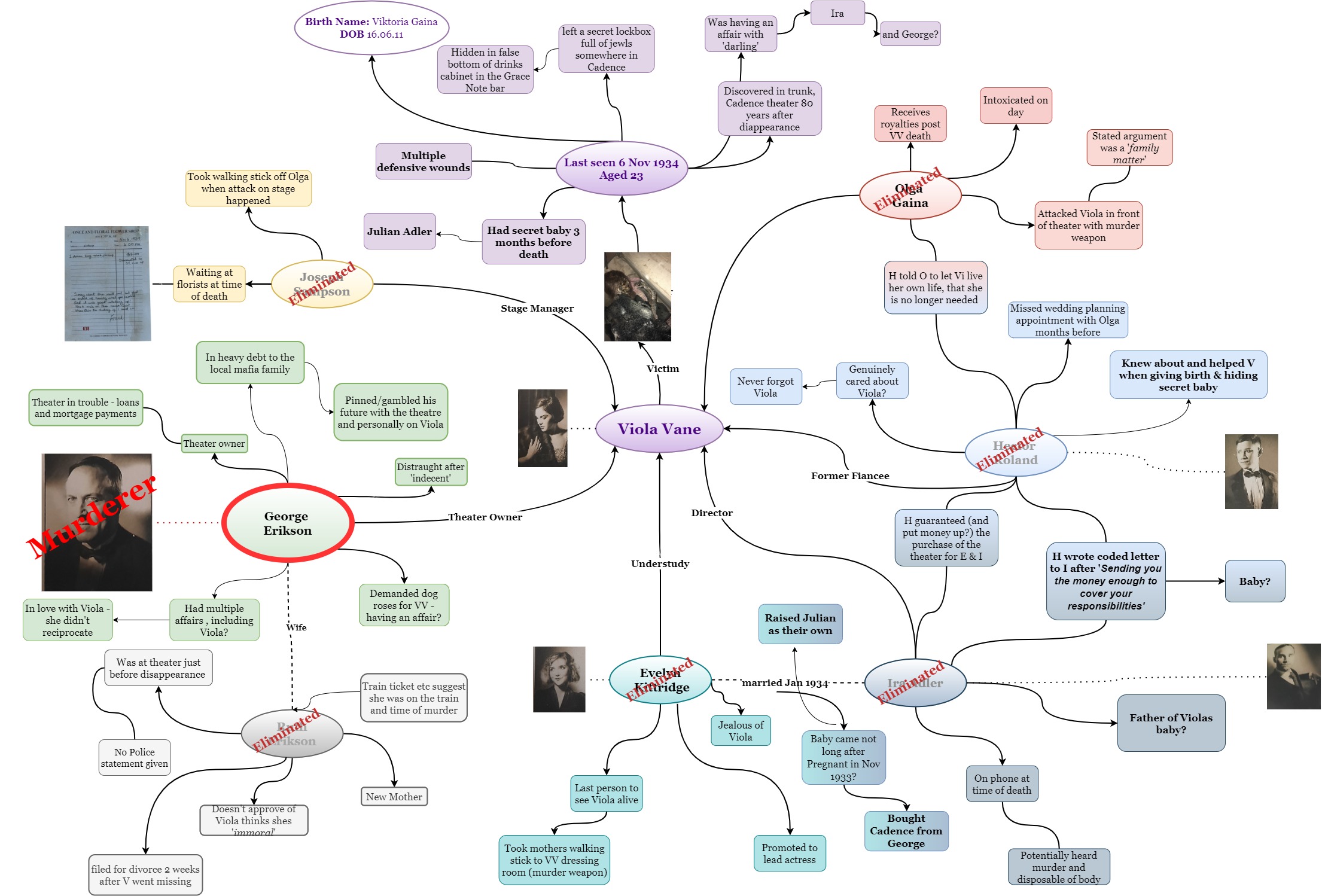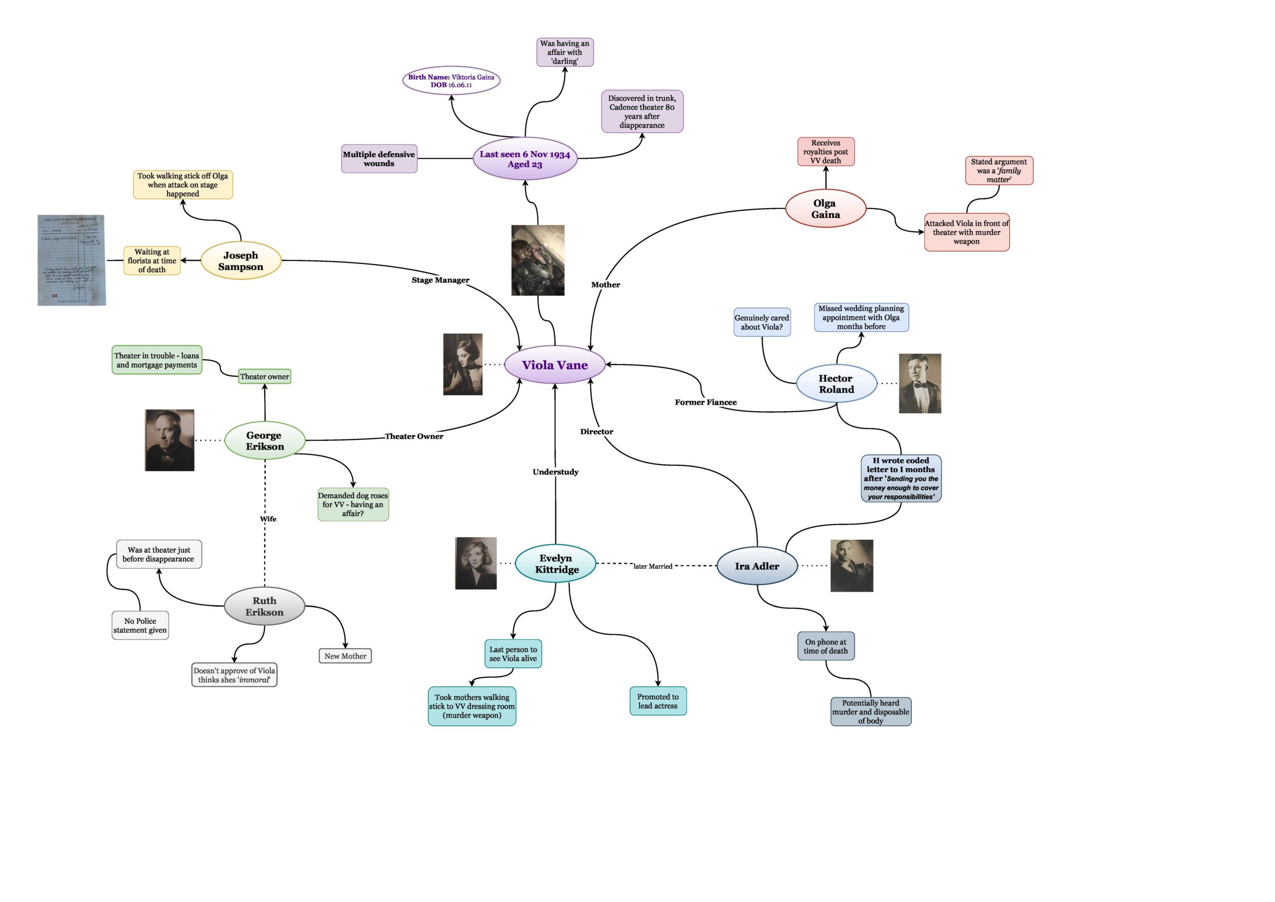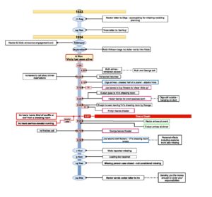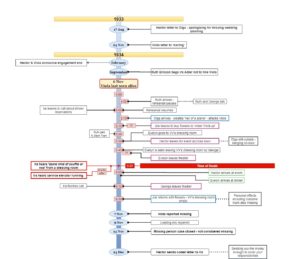 Murder Board ONE First iteration, finalised after going through Evidence Pack Two TWO Second version, following Evidence Pack Three Three Third version, following Evidence Pack Four Four Fourth iteration, finalised after going through Evidence Pack Five FINAL Final Version after closing the case Timeline one First iteration, finalised after going through Evidence Pack Two two Second version, following Evidence Pack Three three Third version, following Evidence Pack Four Four Fouth iteration, finalised after going through Evidence Pack Five FINAL Final Timeline after closing the case