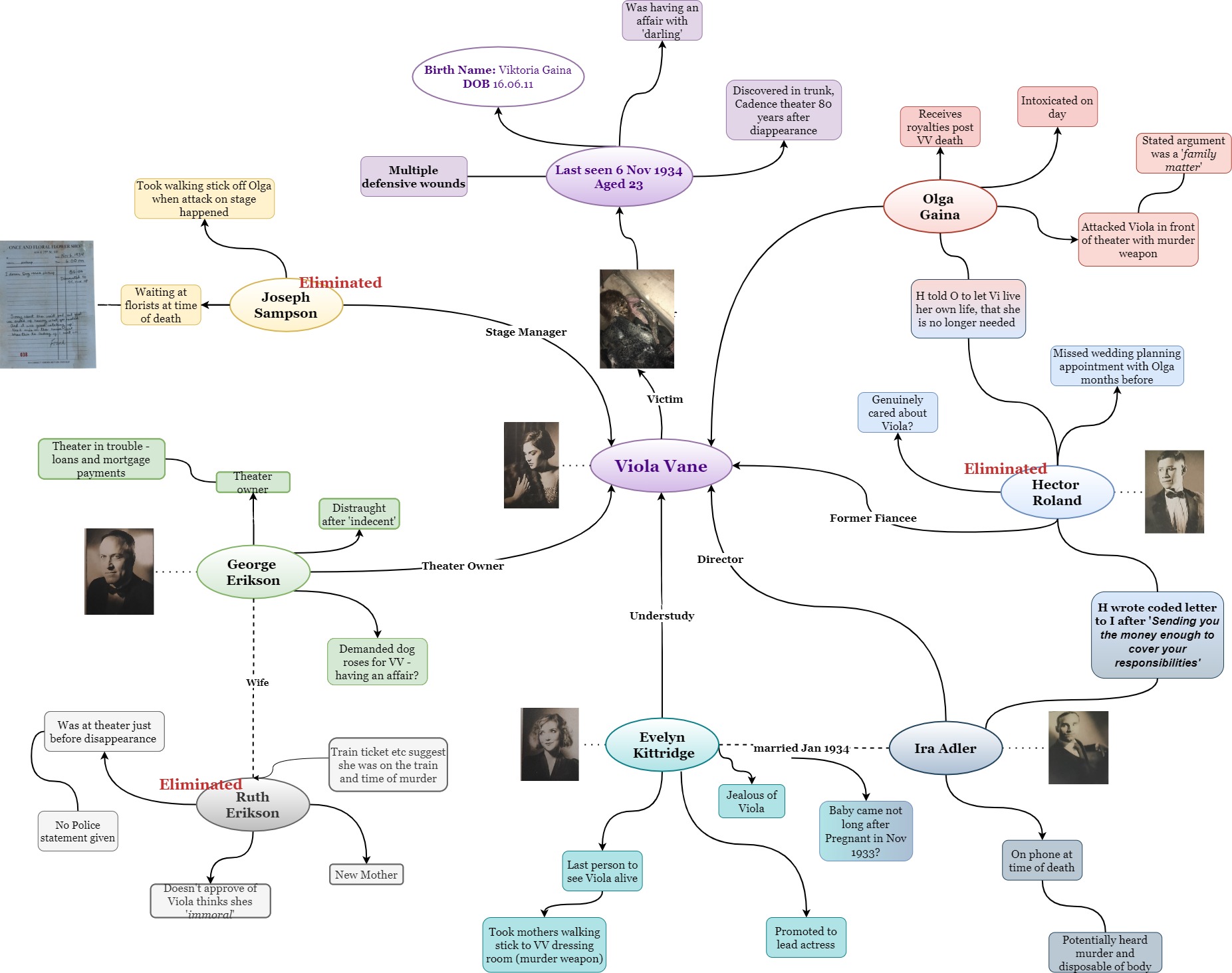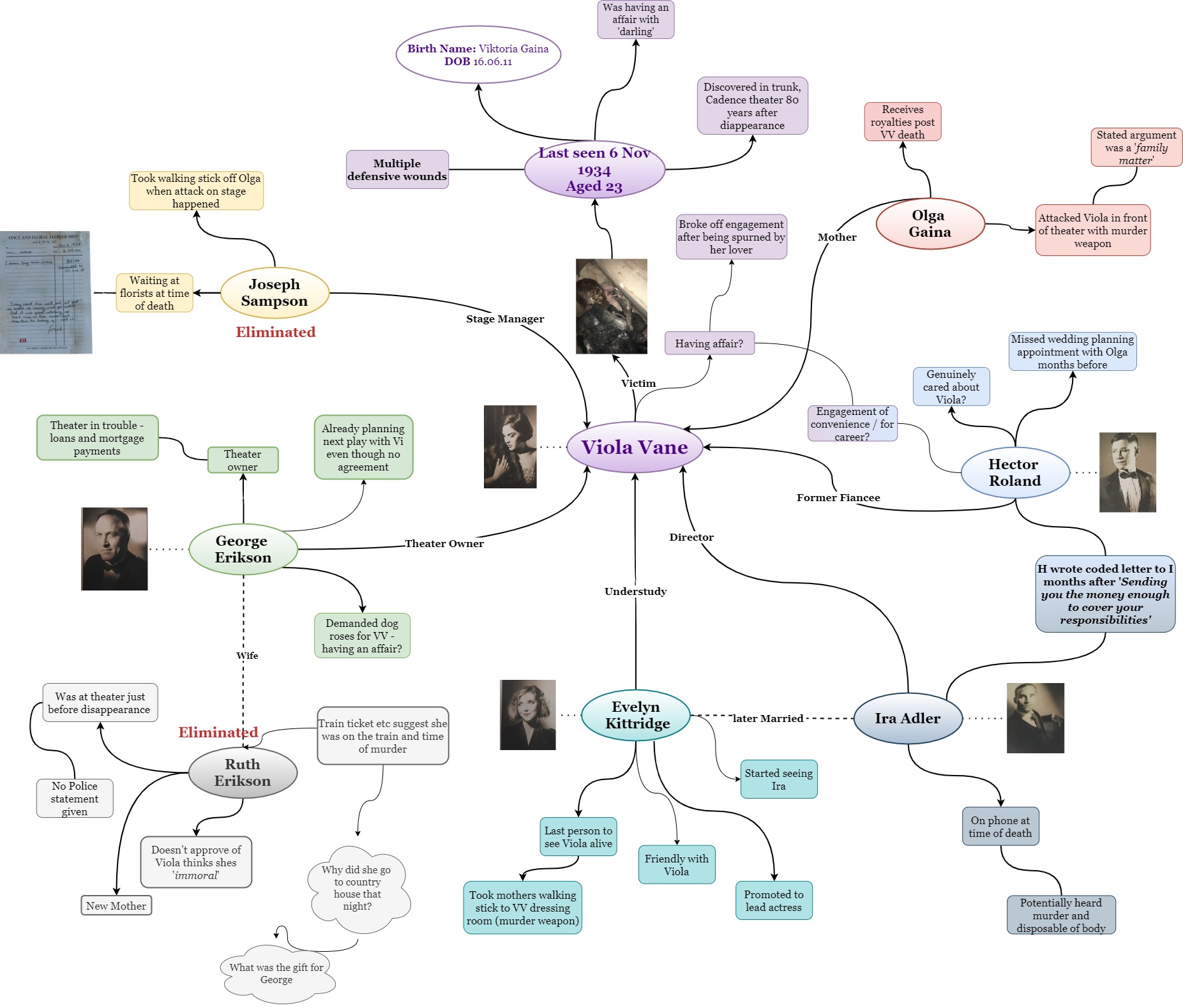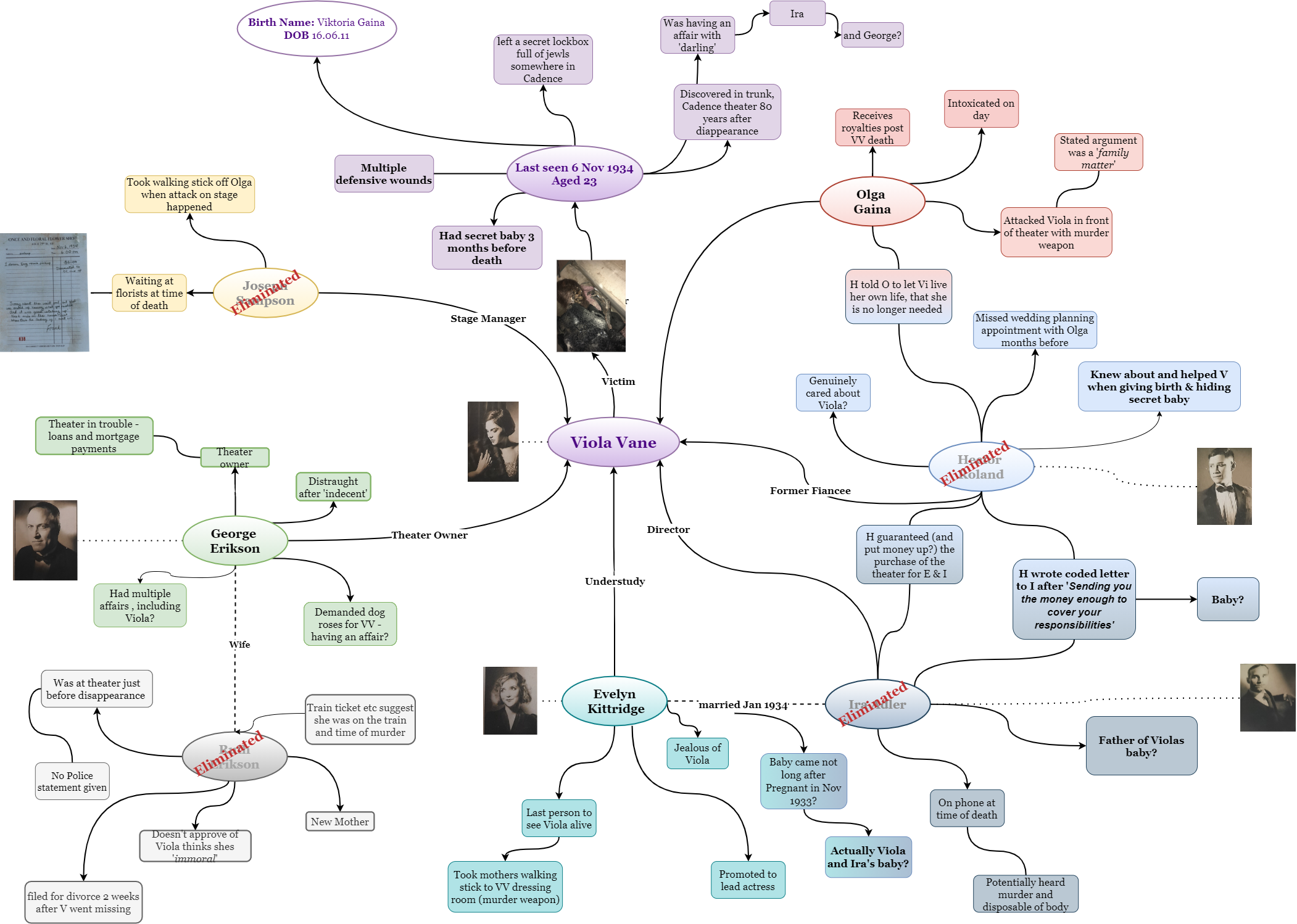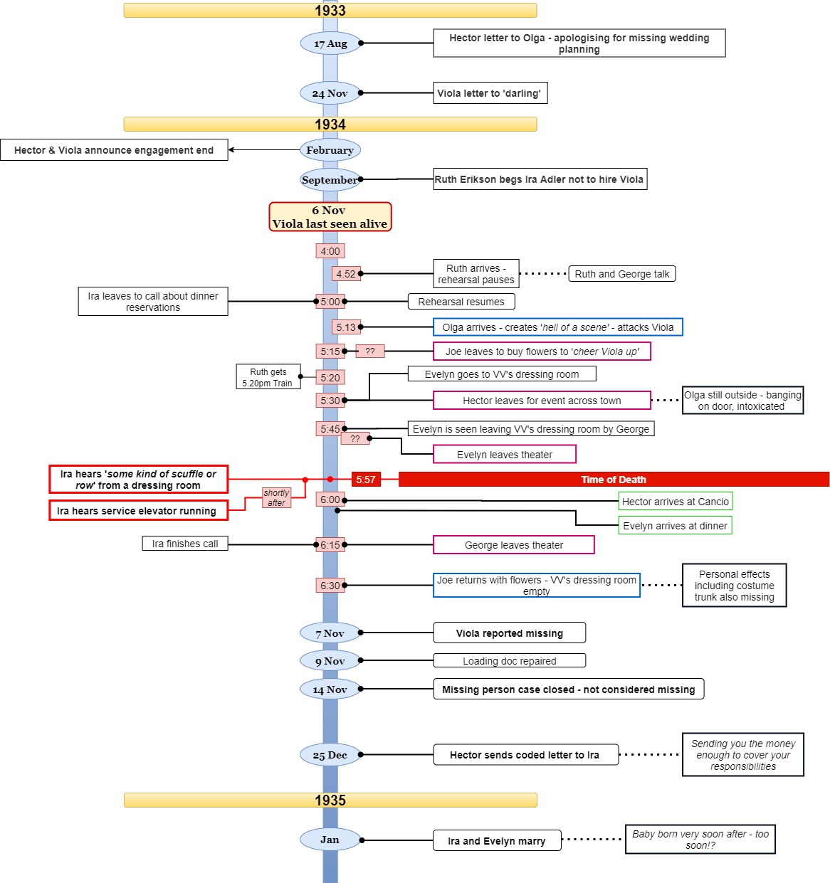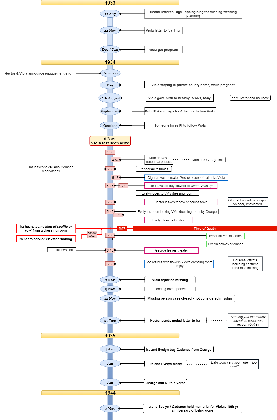 Murder Board ONE First iteration, finalised after going through Evidence Pack Two TWO Second version, following Evidence Pack Three Three Third version, following Evidence Pack Four Four Fourth iteration, finalised after going through Evidence Pack Five FINAL Final Version after closing the case Timeline one First iteration, finalised after going through Evidence Pack Two two Second version, following Evidence Pack Three three Third version, following Evidence Pack Four Four Fouth iteration, finalised after going through Evidence Pack Five FINAL Final Timeline after closing the case